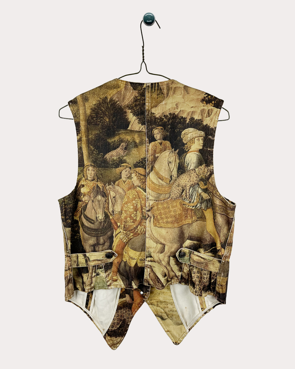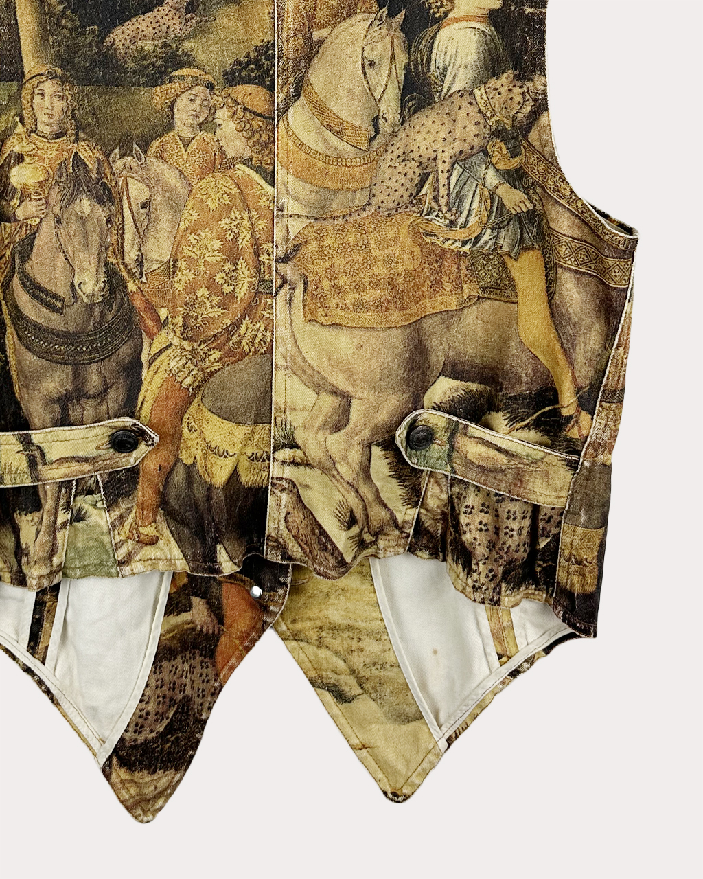 - Off white 색상의 denim 소재 위에 르네상스 시대 작가인 Benozzo Gozzoli (1420~1497)의 ‘동방 박사의 행렬’ 작품을 차용하여 여러 장면을 재구성하여 콜라쥬함